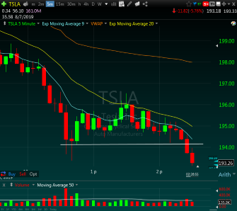 Tesla Inc, 5 Minute, 6 indicators, 2 panes, 1 drawings