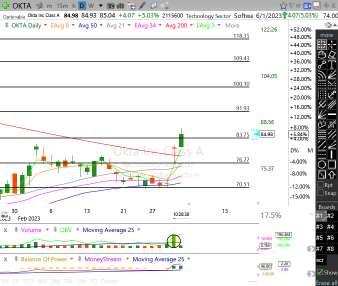 Okta Inc Class A, Daily, 14 indicators, 3 panes, 37 drawings
