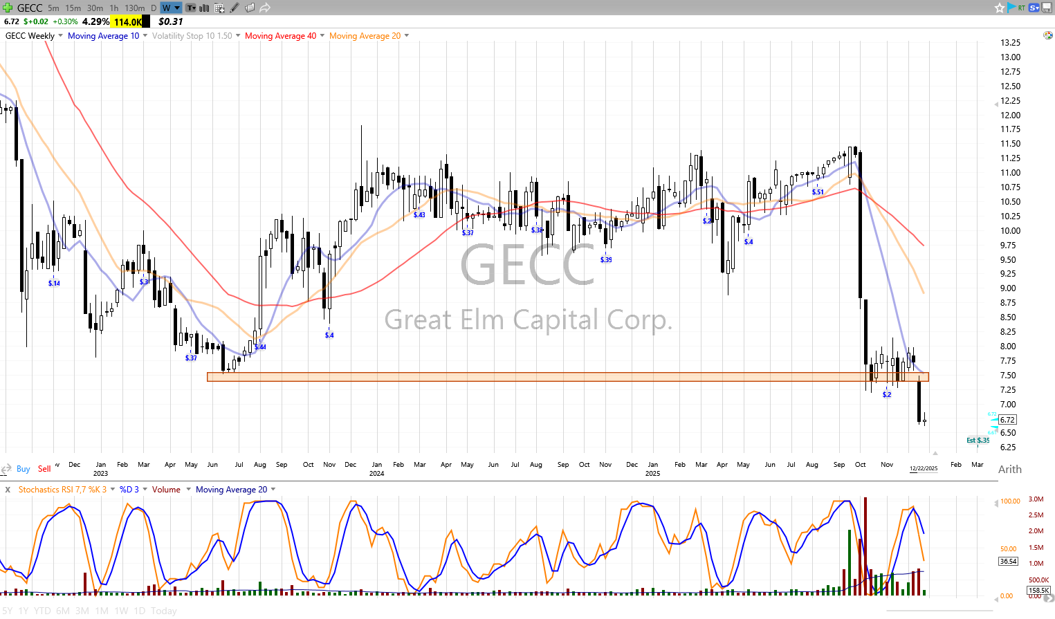 Great Elm Capital Corp., Weekly, 9 indicators, 2 panes, 1 drawings