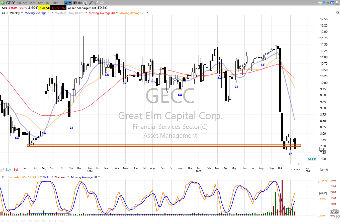 Great Elm Capital Corp., Weekly, 9 indicators, 2 panes, 1 drawings