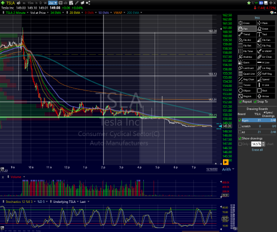 Tesla Inc, 2 Minute, 12 indicators, 3 panes, 22 drawings